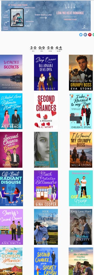 Click this link to go to a Freebie Fair of low to no-heat romance including a 6-chapter preview of my book, Her Colorado Cowboy. Nearly 40 authors offering everything from bonus chapters to multi-chapter previews (like mine) to full books — all for free!! Get it soon, because it’s a limited-time offer!
